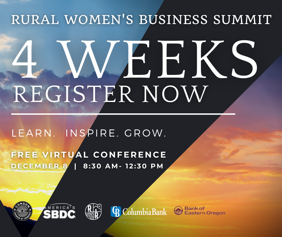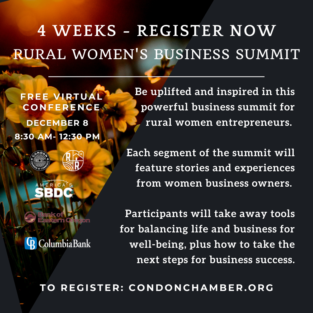 Condon Rural Women's Business Summit: This half day personal and professional development summit will offer more than just tips for growing your organization or business. It will offer inspiration, hope and recognition for the lives we are living. You will walk away with tips and tools, new friends and a renewed energy for what's next. See attached flyer & sample Facebook Post - please consider sharing, Register Here <https://condonchamberofcommerce.growthzoneapp.com/ap/Events/Register/4rk5vzJP?mode=Attendee>