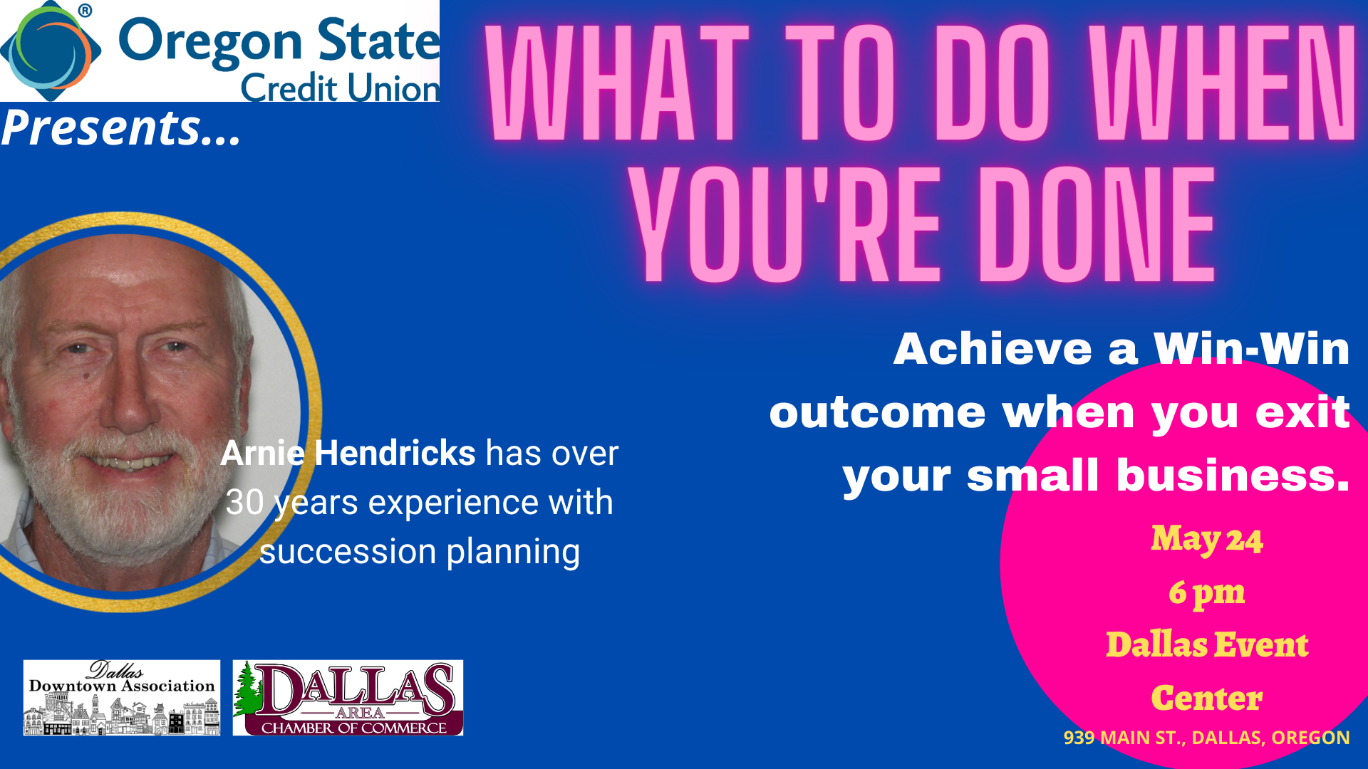 Please pass along, promote and consider attending. We're bringing Arnie down from Seattle/Tacoma as a regional expert on the subject of small business succession planning.