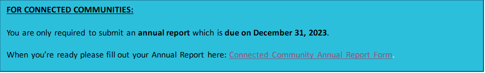 [FOR CONNECTED COMMUNITIES: You are only required to submit an annual report which is due on December 31, 2023. When you're ready please fill out your Annual Report here: Connected Community Annual Report Form.]