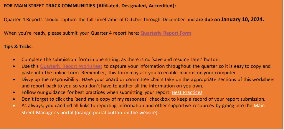 [FOR MAIN STREET TRACK COMMUNITIES (Affiliated, Designated, Accredited): Quarter 4 Reports should capture the full timeframe of October through December and are due on January 10, 2024. When you're ready, please submit your Quarter 4 report here: Quarterly Report Form Tips & Tricks: * Complete the submission form in one sitting, as there is no 'save and resume later' button. * Use this Quarterly Report Worksheet to capture your information throughout the quarter so it is easy to copy and paste into the online form. Remember, this form may ask you to enable macros on your computer. * Divvy up the responsibility. Have your board or committee chairs take on the appropriate sections of this worksheet and report back to you so you don't have to gather all the information on you own. * Follow our guidance for best practices when submitting your report: Best Practices * Don't forget to click the 'send me a copy of my responses' checkbox to keep a record of your report submission. * As always, you can find all links to reporting information and other supportive resources by going into the Main Street Manager's portal (orange portal button on the website).]
