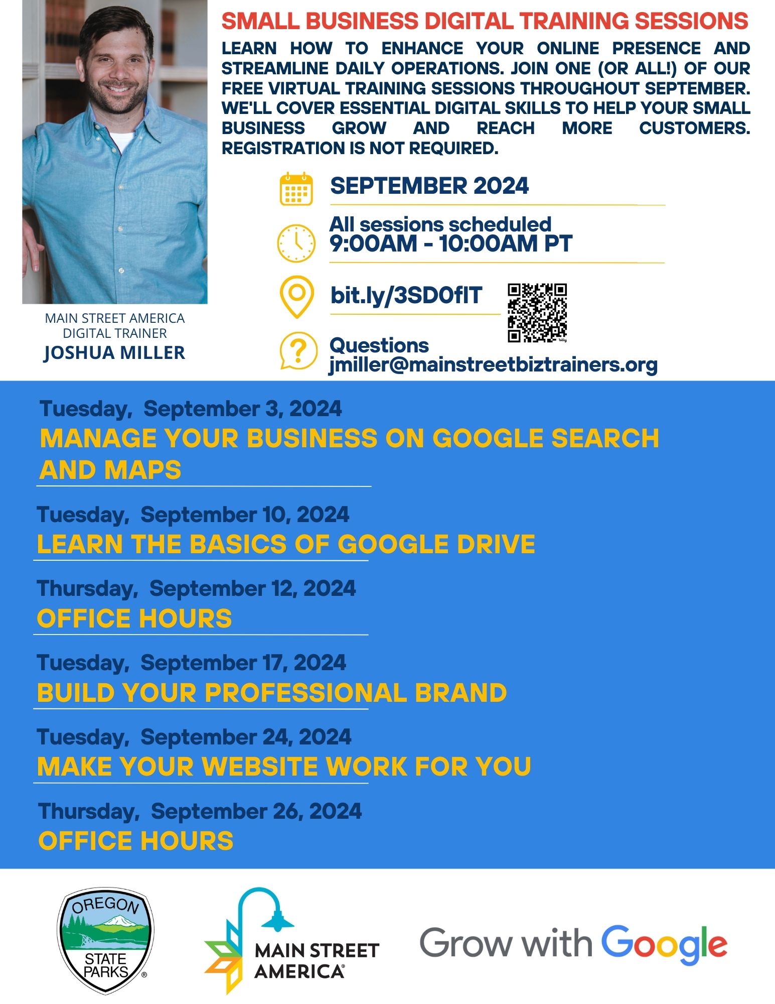 Attached is the flyer for the dates of the digital workshops in September. Please share with your business owners and encourage them to attend. This is a wonderful opportunity we have through our partnership with Main Street America with funding that was provided by Google.
